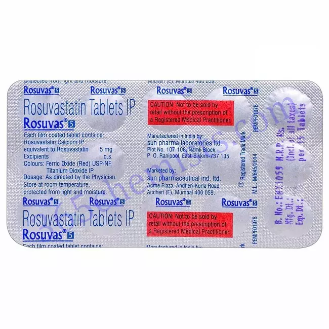 Rosuvas 5mg Tablet is an effective medication for managing cholesterol levels and promoting heart health. Its active ingredient, rosuvastatin, is what makes this medication work so well. The Rosuvas 5mg Tablet helps reduce the risk of cardiovascular events and supports overall heart health. It accomplishes this by increasing HDL cholesterol while simultaneously lowering LDL cholesterol. It is essential, in order to achieve the best results possible, that you adhere to the dosage that has been prescribed for you, that you regularly monitor your cholesterol levels, and that you adopt a healthy lifestyle. Your healthcare provider will be able to help you effectively manage your cholesterol levels and ensure that you receive the maximum benefits from the Rosuvas 5mg Tablet if you work closely with them.
