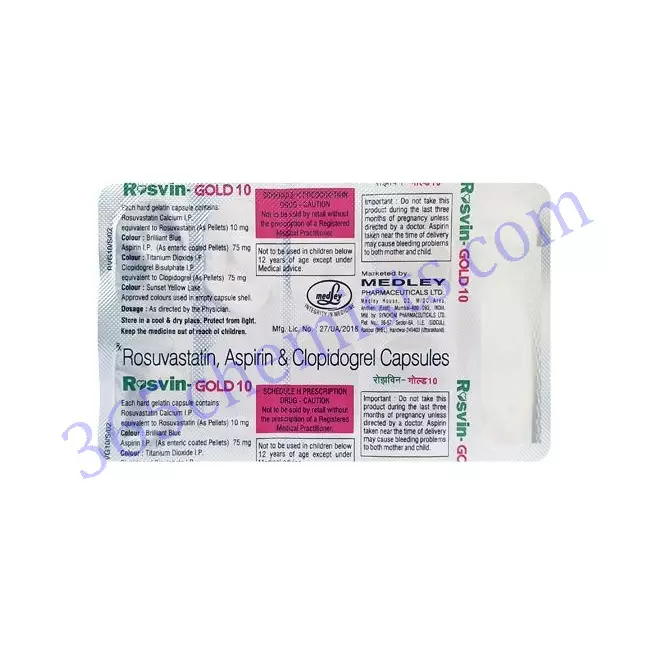 In order to deliver all-around support for the cardiovascular system, the aspirin, rosuvastatin, and clopidogrel contained in the Rosvin Gold 10mg Capsule have been combined with one another. The management of the various risk factors associated with heart disease requires the participation of each component individually.
