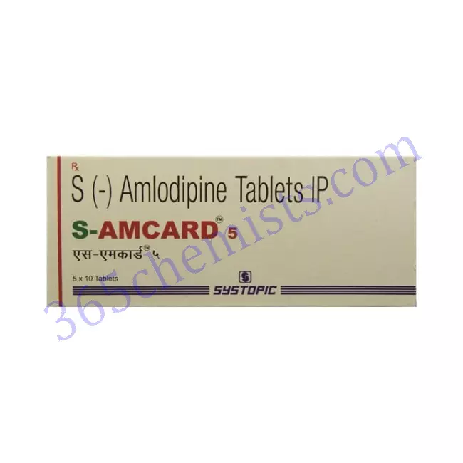 S-Amcard 5mg Tablet Is Known for Its Effectiveness In Controlling High Blood Pressure S-Amcard 5mg Tablet is well known for its effectiveness in controlling high blood pressure. The relaxation of the blood vessels contributes to a reduction in the resistance to blood flow, which in turn contributes to a reduction in blood pressure levels. The complications that are associated with hypertension, such as heart disease, stroke, and kidney problems, can be helped to be avoided by doing this.