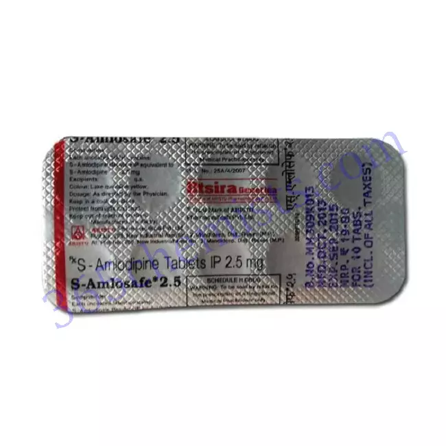 Controlling High Blood Pressure Effectively The S-Amlosafe 2.5mg Tablet is an effective treatment for controlling high blood pressure, also referred to as hypertension. This tablet helps lower blood pressure, which in turn reduces the risk of cardiovascular complications that are associated with hypertension. It does this by lowering peripheral vascular resistance and promoting vasodilation.