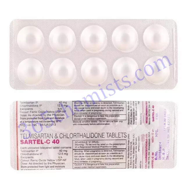Sartel-C 40 Tablet is a combination of Telmisartan and Chlorthalidone. It is a medicine used for the treatment of hypertension (high blood pressure). This medicine relaxes the blood vessels to promote the smooth flow of blood and increases water excretion from the body, thus decreasing high blood pressure.