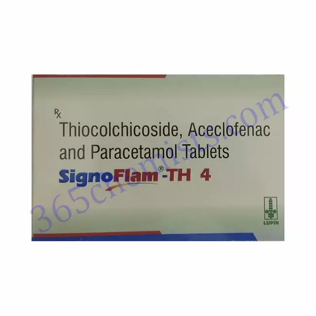 It is common practise to use the combination medication known as Signoflam-TH Tablet (Thiocolchicoside 4mg/Aceclofenac 100mg/Paracetamol 325mg), which is prescribed for the treatment of the management of pain and muscle spasms associated with a variety of conditions. The Signoflam-TH Tablet offers comprehensive pain relief and relaxation of the muscles as a result of the combination of the beneficial effects of aceclofenac, paracetamol, and thiocolchicoside. Individuals can safely use Signoflam-TH Tablet to alleviate their symptoms and improve their quality of life if they follow the recommended dosage and precautions. If you have any concerns or questions, you should always feel free to consult a healthcare professional for individualised advice and direction. Doing so is always recommended.In conclusion, the Signoflam-TH Tablet (Thiocolchicoside 4mg/Aceclofenac 100mg/Paracetamol 325mg) is a combination medication that is typically used for the treatment of pain as well as the management of muscle spasms. It offers comprehensive relief from multiple aspects of pain and discomfort, which helps improve mobility, and it does this by addressing a variety of these issues. Utilisation of the Signoflam-TH Tablet in a safe and effective manner can be ensured by following the recommended dosage and precautions, as well as seeking medical advice when necessary.
