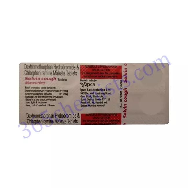 Solvin Cough Tablet 10’s is a combination of two drugs: Chlorphenamine maleate (antihistamine) and Dextromethorphan hydrobromide (cough suppressant). Chlorphenamine maleate belongs to the class of antihistamines or anti-allergic that works by blocking the action of histamine, a substance responsible for causing allergic reactions. It helps to provide relief from allergy symptoms such as sneezing, running nose, watery eyes, itching, swelling, and congestion or stiffness. Dextromethorphan hydrobromide belongs to the class of cough suppressants that block the transmission of nerve signals from the cough centre in the brain to the muscles that produce cough. Thus, together SolvinCough Tablet 10’s helps to relieve cough, cold and allergic symptoms.