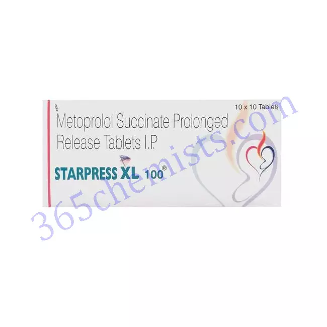 The management of hypertension (high blood pressure) and other cardiovascular conditions can be accomplished with the help of a medication called Starpress XL 100 Tablet, which is available only with a doctor’s prescription. Metoprolol Succinate, which is the active ingredient, is a beta-blocker medication, which is a class of medication that this product belongs to. By lowering blood pressure, reducing the amount of work that needs to be done by the heart, and improving overall cardiovascular health, this medication is beneficial.