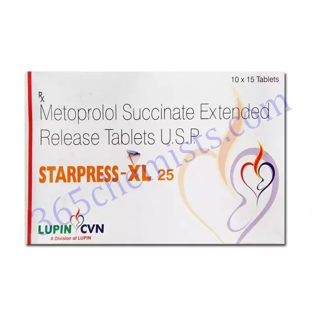 Metoprolol Succinate is the active ingredient in the prescription medicine known as Starpress XL 25mg Tablet. This medication is taken to treat hypertension as well as a variety of cardiovascular conditions. It is helpful in reducing the risk of complications associated with cardiovascular diseases, such as lowering blood pressure and improving heart function. It is essential to take your medication exactly as directed, to tell your doctor about any preexisting conditions or medications, and to keep all of your follow-up appointments so that your doctor can monitor your progress and make any necessary adjustments to your treatment. Consult your healthcare provider if you have any concerns or questions about the Starpress XL 25mg Tablet. They will be able to provide you with individualised guidance and support.