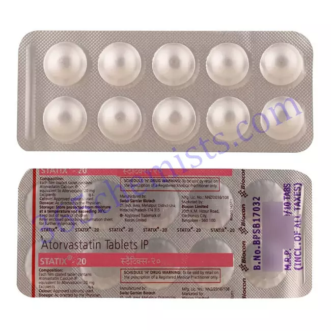 Atorvastatin 20mg, sold under the brand name Statix 20mg Tablet, is a medication that is frequently recommended for the treatment and management of elevated cholesterol levels. It is beneficial in lowering LDL cholesterol and increasing HDL cholesterol, both of which help to reduce the risk of cardiovascular diseases. Statix 20mg Tablet has the potential to be an effective tool for lowering cholesterol levels and improving cardiovascular health, provided that it is used correctly and closely monitored. However, it is absolutely necessary to take the medication exactly as directed, to be aware of any potential adverse effects, and to seek personalised guidance from a qualified medical professional. Statix 20mg Tablet is able to assist individuals in improving their lipid profile while simultaneously lowering the risk of associated complications when these precautions are followed.