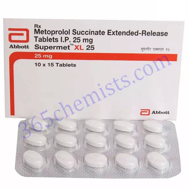 Metoprolol Succinate 23.75mg is the active ingredient in the Supermet XL 25mg Tablet, which is a medication that is used for the management of hypertension, angina, and heart failure. The Supermet XL 25mg Tablet helps improve cardiovascular health and reduces the risk of complications that are associated with it. It achieves this by effectively lowering blood pressure and heart rate. It is essential to take the medication exactly as directed, to be aware of any possible adverse effects, and to seek the guidance of a qualified medical professional for specific recommendations. Individuals who have these cardiovascular conditions may benefit from using the Supermet XL 25mg Tablet effectively as a treatment option if they take it as directed and undergo routine monitoring.