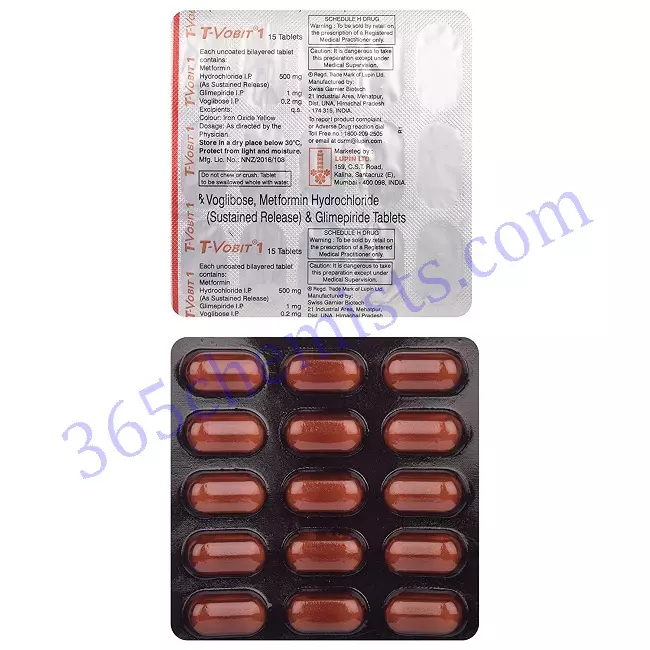 T-Vobit 1 Tablet delivers Comprehensive Glucose Control by addressing Fasting and Postprandial Hyperglycemia The T-Vobit 1 Tablet delivers comprehensive glucose control by addressing both fasting and postprandial hyperglycemia. It is possible to keep stable blood glucose levels throughout the day by taking Glimepiride, Metformin, and Voglibose together because these three medications work synergistically with one another.