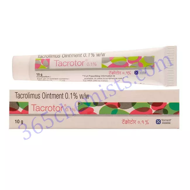 Tacrotor 0.1% Ointment 10 gm contains ‘Tacrolimus‘ that works by suppressing the over-reaction of immune cells in the skin to a stimulus. Thereby, reduces allergic reaction and inflammation (redness and swelling). Also, Tacrotor 0.1% Ointment 10 gm suppresses T and B lymphocytes (cells in the immune system) that normally attacks foreign invaders and defend the body against foreign cells and infection. Thereby prevents organ rejection in transplanted patients and helps the body in accepting the new organ.