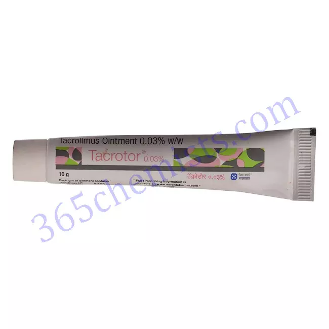 Tacrotor 0.03% Ointment is used for the treatment of eczema (a condition that makes your skin itchy and red). Tacrotor 0.03% Ointment contains tacrolimus as its active ingredient. This medicine is used in patients who do not respond to treatments. It is meant only for external application and should be applied exactly as recommended by your doctor. You may experience some application site reactions as side effects, but they normally fade away with time. Please report to your doctor if you notice the side effects persist or worsen. This medicine is not recommended for use by children below 16 years of age. Before using Tacrotor Ointment, inform the doctor if you are pregnant, planning a pregnancy or breastfeeding and about your detailed medical history.