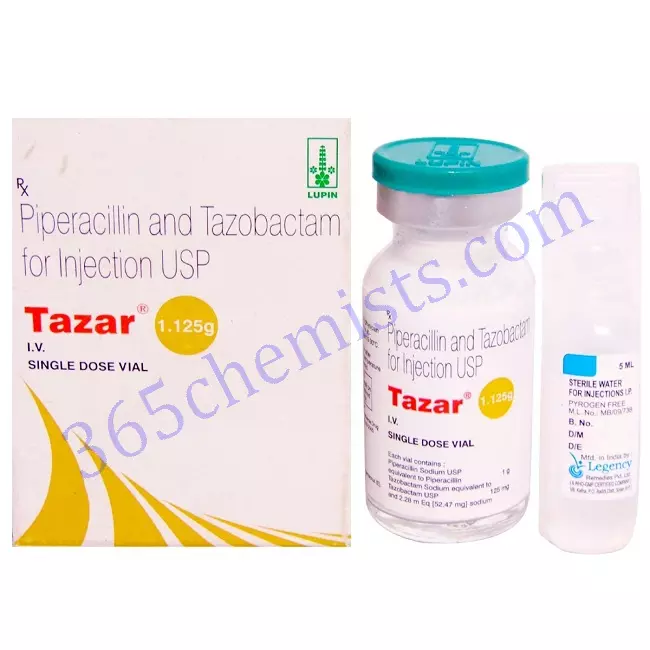 Tazar 1.125gm Piperacillin is a broad-spectrum penicillin antibiotic, and tazobactam is a beta-lactamase inhibitor. Both of these ingredients are combined in the injection. It is through the inhibition of bacterial cell wall synthesis that piperacillin achieves its bactericidal effect. This, in turn, causes the integrity of the cell wall to be compromised, which ultimately results in the death of the bacterial cell. Tazobactam, on the other hand, boosts the activity of piperacillin by inhibiting the enzymes produced by bacteria that are capable of degrading penicillin antibiotics. These enzymes are responsible for the degradation of penicillin antibiotics. This combination offers a broader spectrum of activity against a diverse collection of bacteria that are susceptible to the treatment.