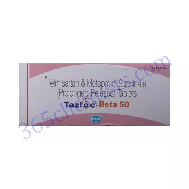 The action of angiotensin II, a hormone that causes blood vessels to constrict, is prevented by the active ingredient telmisartan, which is found in Tazloc Beta 50mg Tablet. Telmisartan helps blood vessels relax by inhibiting the effects of angiotensin II. This results in vasodilation and a reduction in blood pressure. The medication known as metoprolol succinate, on the other hand, is classified as a beta-blocker and is effective because it prevents the effects of adrenaline on the heart from taking place. As a consequence, both the heart rate and the cardiac output slow down, which ultimately leads to a reduction in blood pressure. The action of these two medications in conjunction with one another contributes to more effective control of blood pressure.