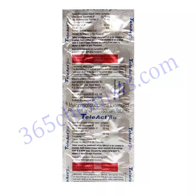 The combination medication known as Teleact Beta 25 mg Tablet (Telmisartan 40mg/Metoprolol Succinate) is prescribed to patients suffering from high blood pressure as well as a variety of heart conditions. It does this by relaxing the blood vessels, which in turn lowers blood pressure and brings the heart rate back into normal range. It is possible that Teleact Beta 25mg Tablet will cause some adverse effects, but in general, people tolerate them quite well. It is essential to take the Teleact Beta 25mg Tablet exactly as directed by your healthcare provider and to comply with all of their recommendations. Consult your healthcare provider for individualised guidance and support in the event that you have any worries or questions regarding this medication.