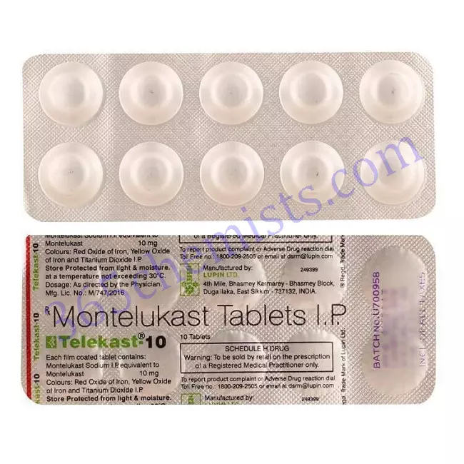 Montelukast serves as the active ingredient in the drug Telekast 10mg Tablet. It is mostly prescribed to treat allergic rhinitis and asthma, easing symptoms like wheezing, shortness of breath, coughing, nasal congestion, sneezing, and itching.