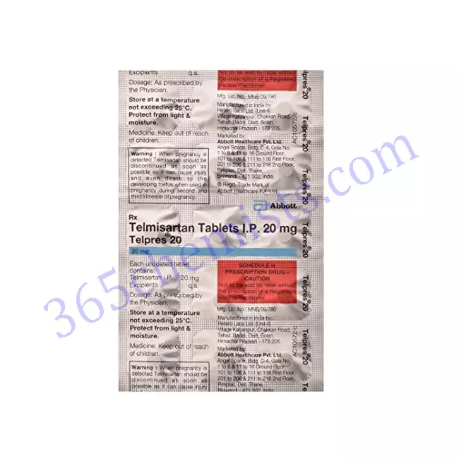 The Telpres 20 Tablet, which is an effective medication for the management of hypertension, contains the active ingredient telmisartan. It accomplishes this by inhibiting the activity of angiotensin II, which in turn helps relax blood vessels and reduces blood pressure. For the best possible outcomes, consistent monitoring of blood pressure and adherence to the recommended dosage are both absolutely necessary. Individuals who have hypertension can improve their long-term health outcomes by making changes to their lifestyles in addition to taking Telpres, which has been shown to have this effect. It is essential to confer with a medical expert in order to obtain individualised recommendations and instructions concerning the utilisation of the Telpres 20 Tablet.