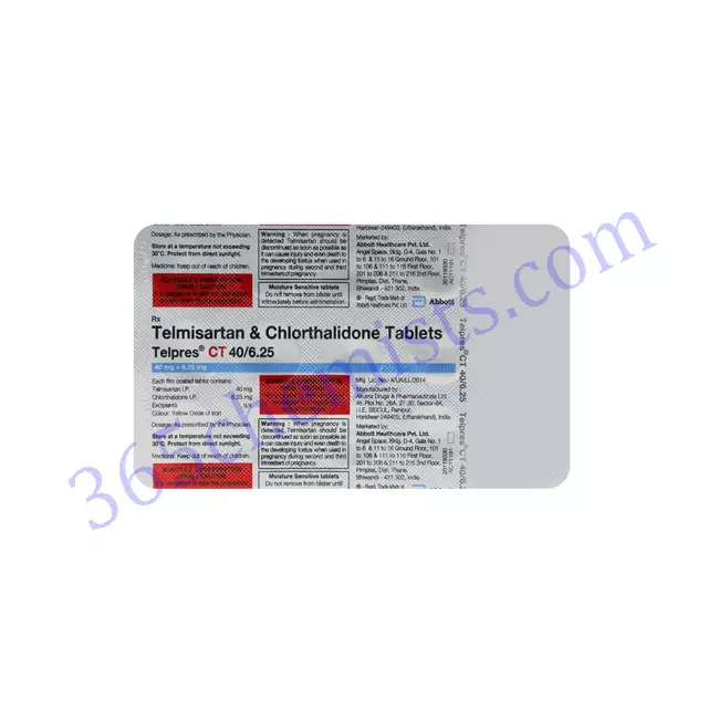 The combination of telmisartan and chlorthalidone found in the Telpres CT 40mg Tablet makes it a useful tool for the management of hypertension. It accomplishes this by inhibiting the action of angiotensin II and enhancing diuresis, both of which contribute to a drop in blood pressure. For the best possible outcomes, consistent monitoring of blood pressure and adherence to the recommended dosage are both absolutely necessary. People who have hypertension who take Telpres CT in addition to making changes to their lifestyles may experience improved long-term health outcomes as a result of the combination of these two treatments. It is essential to confer with a medical expert in order to obtain individualised recommendations and instructions concerning the utilisation of the Telpres CT 40mg Tablet.