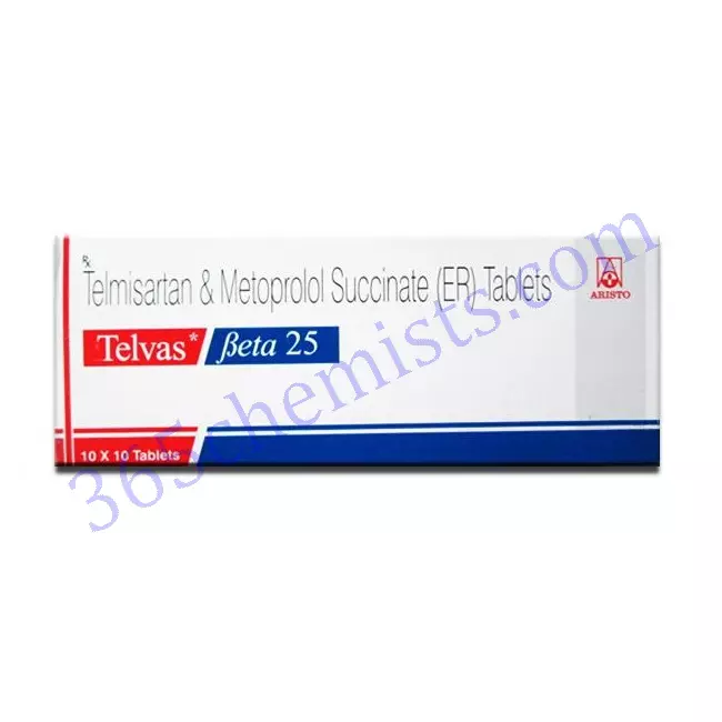 The combination medication known as Telvas Beta 25mg Tablet is prescribed to patients suffering from hypertension (also known as high blood pressure). This tablet contains two active ingredients, Telmisartan and Metoprolol Succinate, which cooperate to effectively control blood pressure and lower the risk of cardiovascular complications. The tablet also contains an inactive ingredient known as Metoprolol Succinate.