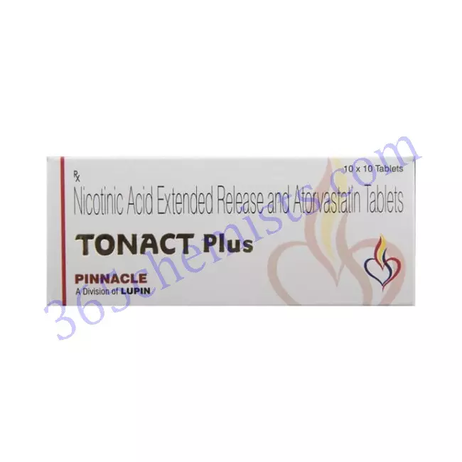 Atorvastatin and Vitamin B3 (Nicotinic Acid) are the two active components that can be found in a single dose of the combination medication known as Tonact Plus Tablet. Individuals who require additional therapy to lower their cholesterol levels are typically given a prescription for this combination drug because it is effective in the management of high cholesterol levels. Atorvastatin is classified as a member of the group of medications known as statins, whereas vitamin B3 is a water-soluble vitamin that is essential to a number of different metabolic processes in the body. They have a synergistic effect that lowers LDL cholesterol levels and improves the overall lipid profile when they are used together.