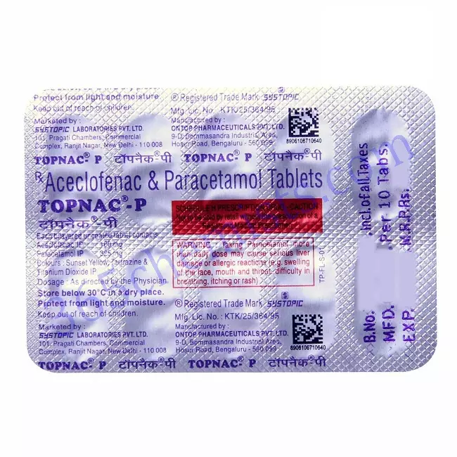 The management of pain and inflammation can be handled in a comprehensive manner with the help of the Topnac P Tablet, which is a combination formulation containing Aceclofenac and Paracetamol. Individuals can ensure that the use of Topnac P Tablet for their pain relief requirements is both safe and effective by following the recommended dosage as well as the precautions and safety information that are provided. It is strongly suggested that any concerns or questions be directed towards a healthcare professional for the purpose of receiving additional direction and clarification.