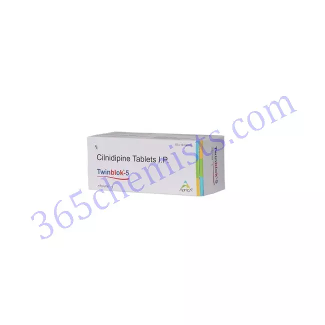 Cilnidipine is the active component in the medication known as Twinblok 5mg Tablet. This tablet is taken by mouth. It is primarily employed for the management of hypertension (also known as high blood pressure), as it is a member of the calcium channel blocker class of medications. In order for Twinblok to work, calcium channels in the blood vessels need to be blocked. This results in the smooth muscles in the blood vessels relaxing, which in turn causes the blood vessels to expand. This contributes to a reduction in blood pressure as well as an improvement in blood flow.