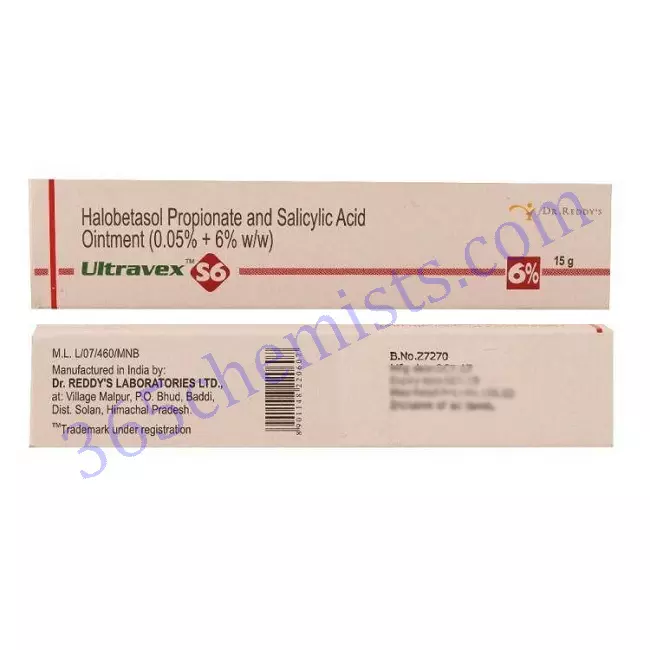 Ultravex S6 Ointment is a topical medicine composed of Ulobetasol and Salicylic Acid. It is used to treat psoriasis (a skin condition that causes red, itchy scaly patches, most commonly on the knees, elbows, trunk, and scalp). This medicine works by reducing the production of chemical substances that cause swelling and itching.