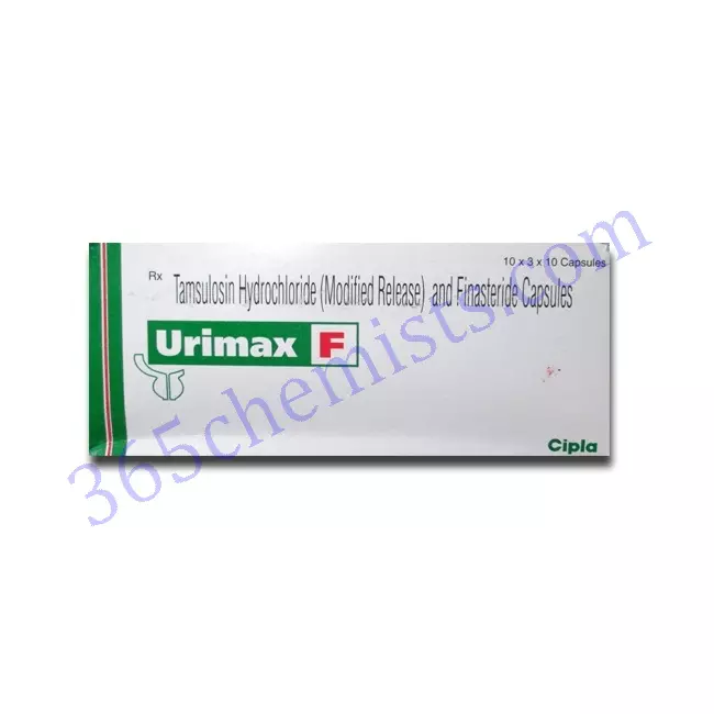 0.4 mg/5 mg URIMAX-F Tamsulosin and Finasteride, two active components, are combined in capsules to create a single drug. The condition known as benign prostatic hyperplasia (BPH), which is characterised by an enlarged prostate gland, is the main indication for its prescription. Tamsulosin and Finasteride work together to increase urine flow and lessen BPH-related urinary symptoms.