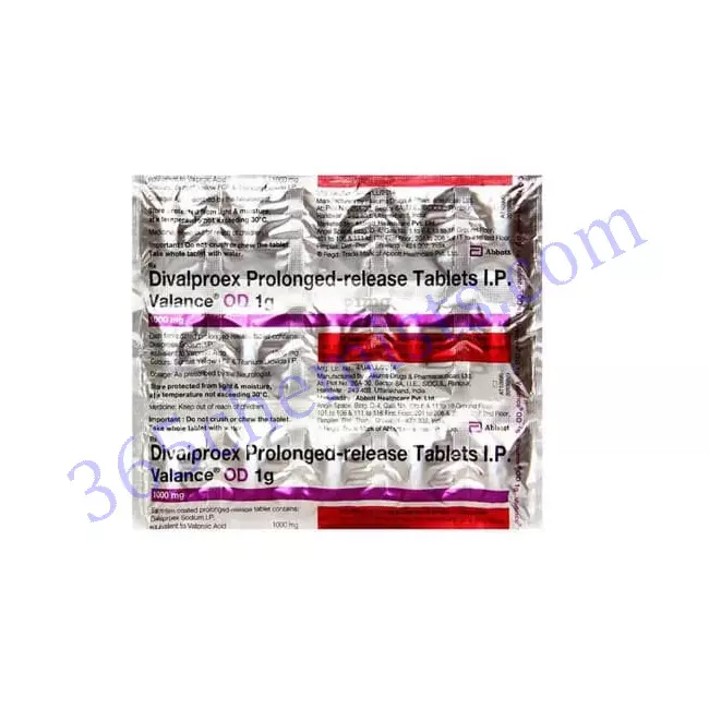 Valance OD 1gm contains Divalproex sodium which belongs to a class of drugs called anti-epileptics. It is a stable coordination compound comprised of sodium valproate and valproic acid used to treat manic episodes associated with bipolar disorder, epilepsy, and migraine headaches. It is used to treat manic episodes associated with bipolar disorder alone or with other medicines to treat complex partial seizures in adults and children above 10 years of age, simple and complex absence seizures and prevents migraine headaches.