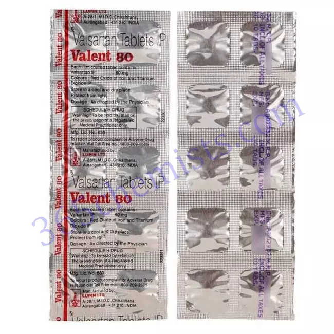 Valsartan, which is contained in Valent 80mg Tablet, exerts its therapeutic effect by inhibiting the activity of angiotensin II, a hormone known for its ability to narrow blood vessel diameter. Valsartan helps to relax blood vessels by preventing the effects of angiotensin II, which in turn makes it possible for blood to flow more easily and results in a reduction in blood pressure. The Valent 80mg Tablet is an effective blood pressure control medication that does not significantly affect the rate of the heart.