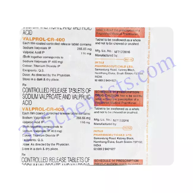 Valprol CR 400mg Tablet is an important medication for the treatment and management of epilepsy. Its active ingredients are Sodium Valproate 266mg and Valproic Acid 116mg, and it comes in the form of a tablet. It accomplishes this by elevating GABA levels in the brain, which, in turn, effectively controls epileptic seizures and improves overall quality of life for epileptic patients. Utilisation of the Valprol CR 400mg Tablet in a manner that is both safe and effective requires strict adherence to the recommended dosage, awareness of any and all possible adverse effects, and ongoing communication with a qualified medical professional. Individuals can experience better seizure control and overall wellbeing if they are provided with the appropriate medical guidance.