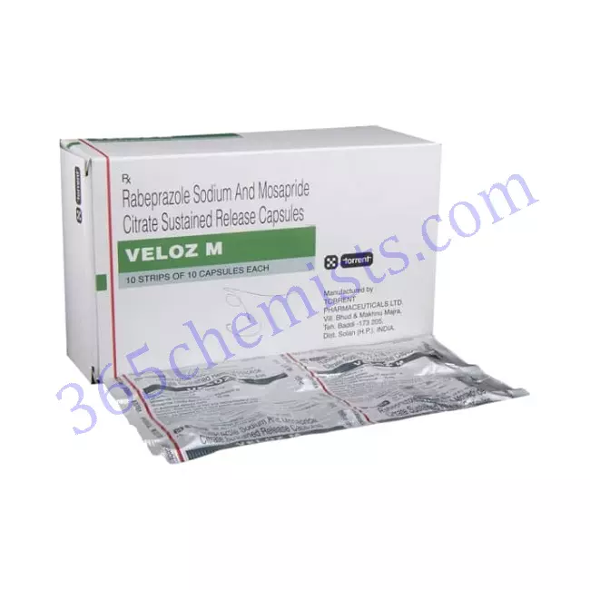Veloz M Capsule is a combination medicine that typically contains rabeprazole (a proton pump inhibitor) and mosapride (a prokinetic agent). Rabeprazole reduces excess stomach acid production, while mosapride improves stomach movement and prevents acid from backing up into the esophagus.