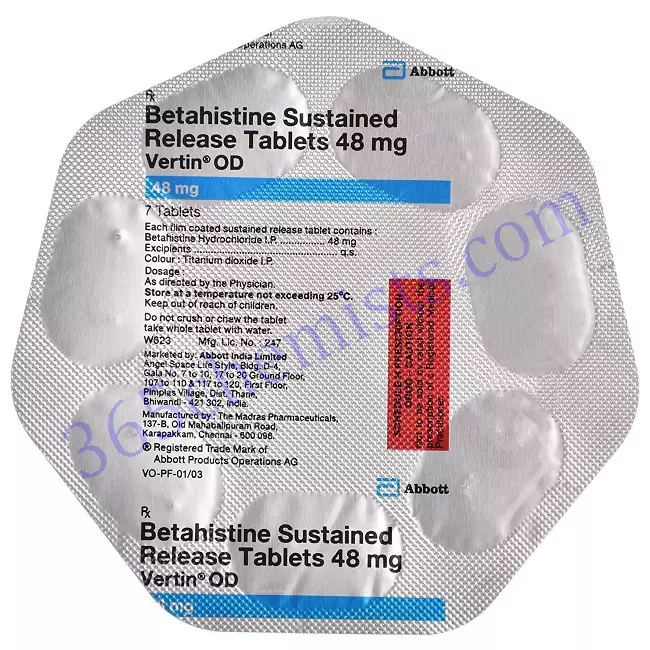 Vertin OD 48mg Tablet SR is used to prevent and treat a disorder of the inner ear known as Ménière’s disease. The symptoms include dizziness (vertigo), ringing in the ears (tinnitus), and loss of hearing, probably caused by fluid in the ear. This medicine helps relieve the symptoms by reducing the amount of fluid.