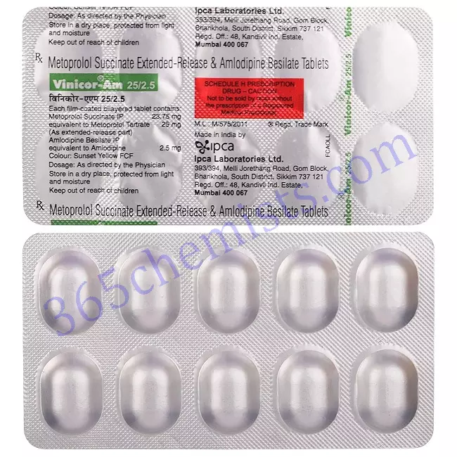 Amlodipine and metoprolol succinate are both components of the combination medication known as Vinicor AM 25mg Tablet, which is prescribed for the treatment and management of hypertension. It accomplishes these goals by combining the workings of a calcium channel blocker with those of a beta-blocker, which results in synergistic effects that reduce blood pressure and enhance cardiovascular health in general. Vinicor AM 25mg Tablet should only be used in accordance with the recommended dosage, after taking all appropriate precautions, and after discussing any side effects or problems with a qualified medical professional. Patients who have hypertension rely heavily on it to achieve and maintain optimal blood pressure control, which is a significant accomplishment in and of itself.