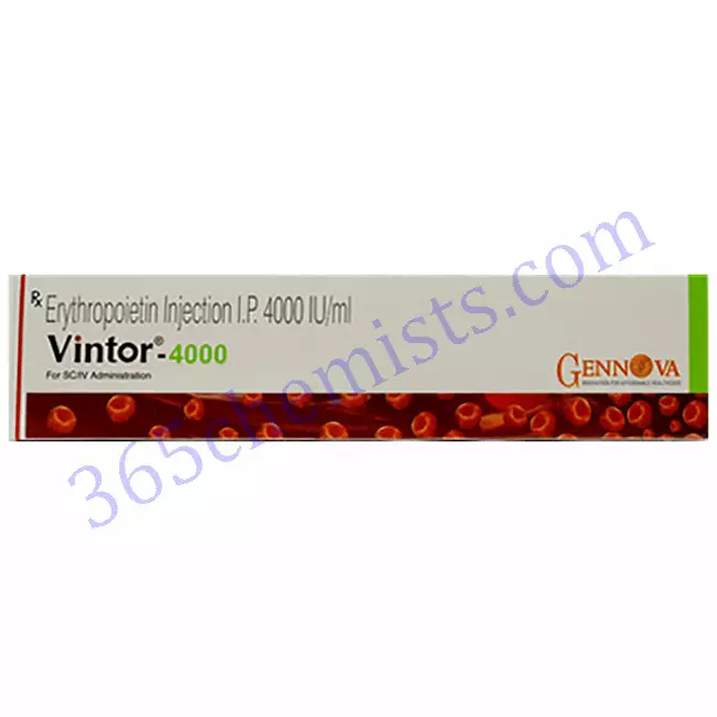 Vintor 4000 IU Injection is a synthetic form of a protein that regulates the formation of red blood cells in the body. It is used to treat anemia caused due to severe kidney disease or cancer medications. It is also used during certain surgeries to decrease the need for blood transfusion.