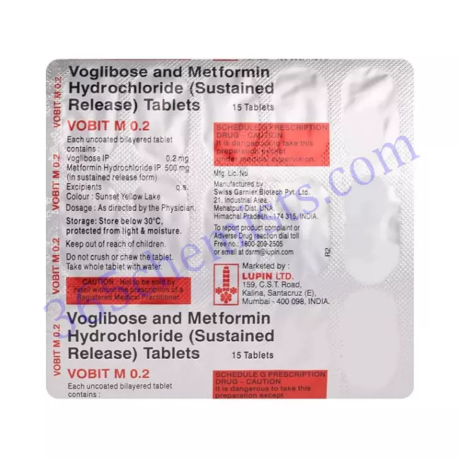 Metformin and voglibose are the active ingredients in one variant of the tablet known as Vobit M 0.2. Metformin is a type of medication known as a biguanide. It acts to improve insulin sensitivity by decreasing the amount of glucose produced by the liver and increasing the amount of glucose taken in by the body’s peripheral tissues. As an alpha-glucosidase inhibitor, voglibose slows down the absorption of carbohydrates in the small intestine. As a result, glucose is released into the bloodstream at a more gradual pace after meals.