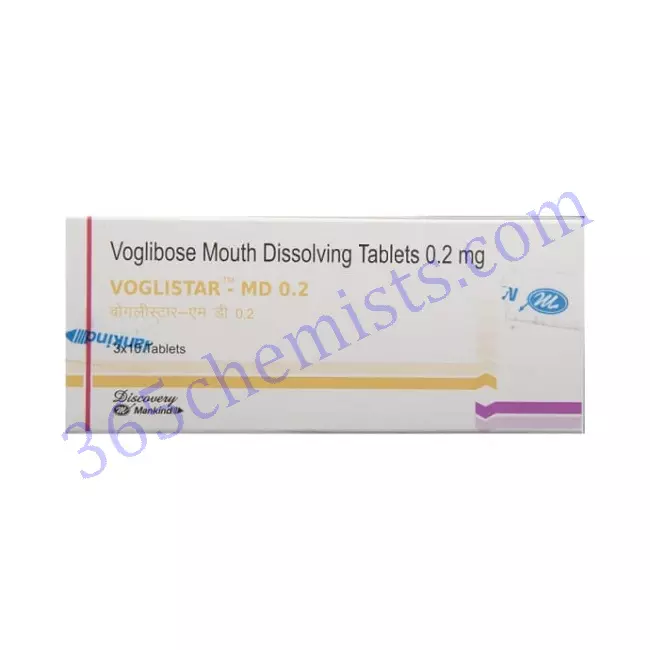 - Voglistar-MD 0.2mg Tablet assists persons in achieving better overall glycemic control by helping to successfully manage postprandial hyperglycemia. This allows for improved glycemic control. It does this by contributing to steady and healthy glucose levels throughout the day by managing the blood sugar levels that occur after meals. It is absolutely necessary to achieve and sustain optimal glycemic control in order to lower the risk of complications associated with diabetes.