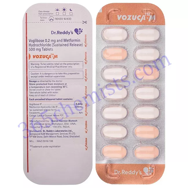 Vozuca M 0.2mg Tablet is a combination of two antidiabetic medicines: Metformin and voglibose. Metformin lowers the production and absorption of sugar in your body and allows better use of existing insulin. Voglibose inhibits the intestinal enzymes that cause breakdown of complex sugars into simple sugars such as glucose. This prevents blood glucose from rising very high after meals.