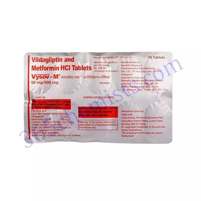 Vildagliptin and Metformin, which are both included in the Vysov-M 50mg/500mg Tablet, constitute an efficient combination therapy that is beneficial for those who have type 2 diabetes. This medicine provides comprehensive glycemic control since it acts on insulin secretion, glucagon release, insulin resistance, and hepatic glucose generation. Clinical studies have shown that it is effective in lowering blood glucose levels and improving HbA1c levels. Additionally, it has other benefits such as a reduced risk of hypoglycemia and the ability to preserve the function of beta cells in the pancreas. For best management of diabetes, it is essential to seek personalised guidance from a qualified medical practitioner, strictly follow to the treatment plan that has been provided, and make any required adjustments to one’s way of life. In conjunction with leading a healthy lifestyle, the Vysov-M 50mg/500mg Tablet may be of assistance to persons in properly managing their diabetes and improving their overall well-being.