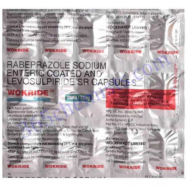 Wokride 75 Capsule is a medication that combines Levosulpiride and Rabeprazole as its active ingredients. It is commonly prescribed to treat various gastrointestinal disorders, including gastroesophageal reflux disease (GERD), functional dyspepsia, and other conditions characterized by excessive stomach acid production and impaired gastrointestinal motility.