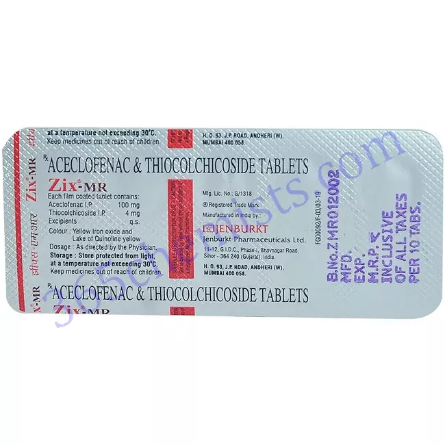 Zix-MR Tablet is a combination medication that contains the active ingredients Aceclofenac and Thiocolchicoside. This medication comes in the form of a tablet. It is commonly prescribed for the management of pain as well as muscle spasms associated with a variety of conditions that affect the musculoskeletal system. Important information pertaining to Zix-MR Tablet, including its applications, dosage, safety precautions, and potential adverse effects, will be provided by this detailed description.