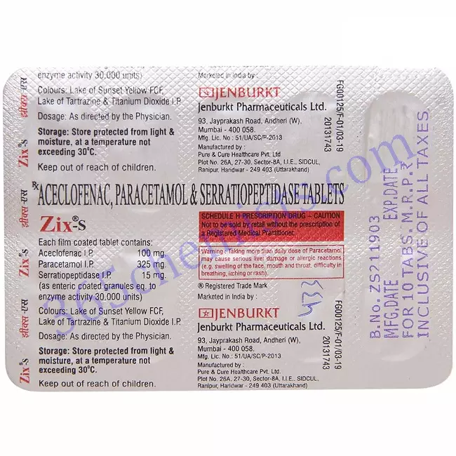 Zix S Tablet is a combination of three medicines: Aceclofenac, Paracetamol/Acetaminophen and Serratiopeptidase. Aceclofenac is a non-steroidal anti-inflammatory drug (NSAID), and Paracetamol/Acetaminophen is an antipyretic (fever reducer). They work by blocking the release of certain chemical messengers in the brain that cause pain and fever. Serratiopeptidase is an enzyme which works by breaking down abnormal proteins at the site of inflammation and promotes healing.