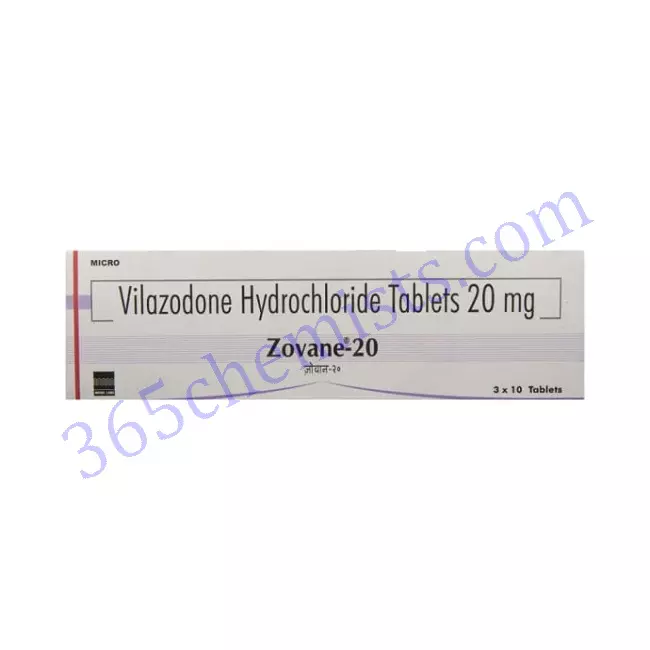 Vilazodone is the active component of the medication that is available under the brand name Zovane 20mg Tablet. The primary indication for its application is the treatment of major depressive disorder (MDD), which places it in the category of medications known as selective serotonin reuptake inhibitors (SSRIs). By restoring the balance of the neurotransmitter serotonin in the brain, the antidepressant medication Zovan can help relieve some of the symptoms of depression. This detailed guide explains important information about Zovane 20mg Tablet, such as its applications, recommended dosage, potential adverse effects, and safety measures.