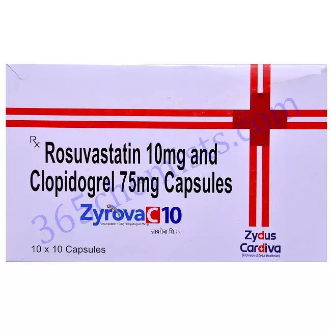 The Zyrova C 10mg Capsule is a combination medication that contains Rosuvastatin and Clopidogrel as its two active ingredients. It is most commonly prescribed for the management of certain cardiovascular conditions, such as high cholesterol and the prevention of blood clots, as well as other conditions related to the heart and blood vessels. Rosuvastatin is a statin medication that helps lower cholesterol levels, and clopidogrel is an antiplatelet medication that helps prevent platelets from forming blood clots. Both of these medications are known as rosuvastatin and clopidogrel.